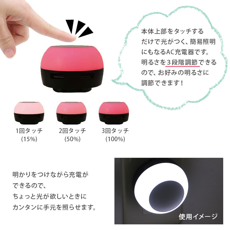 (PCやタブレットは1台で充電してください)・本体丈夫をタッチすることにより、LEDランプが点灯します。